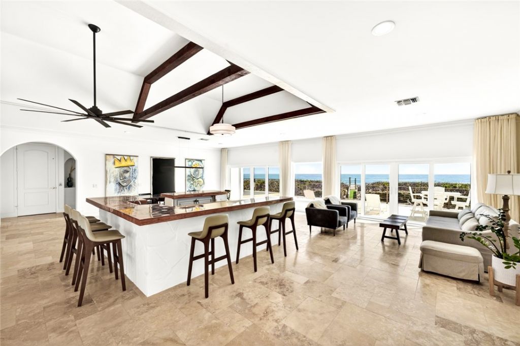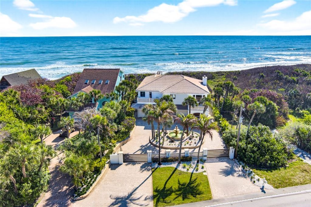 Oceanfront estate uniquely positioned with the river just beyond, capturing sweeping water vistas in every direction. This exceptional 5BR/4.5BA residence spans over 5,000 SF with private beach access. A recent refresh introduces new gates, balconies, exterior paint, and landscaping. Interior spaces are designed for elevated living, featuring a game room, sauna, and generous gathering areas. Dual primary suites and full kitchen on both levels with an elevator for easy access. Impact glass throughout. Two-car garage and circular driveway. Sizes approx./Subj. to error.