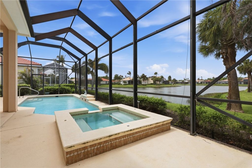 Lakefront beauty located in Island Club Riverside. This spacious 3-bedroom, 2 bath home w/ office, perfect for working from home or extra living space. Enjoy serene water views from your large, private screened patio complete with a pool and spa?ideal for relaxing or entertaining. Inside, the home boasts tile and wood flooring throughout, crown molding, and plantation shutters. The living room includes custom built-in wall units, adding both style and functionality. Island kitchen featuring granite countertops and a stylish tile backsplash. A perfect blend of comfort & elegance.