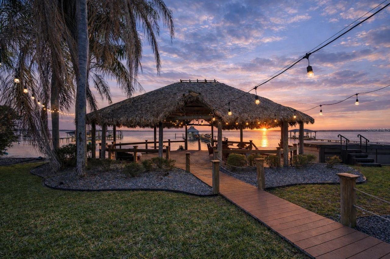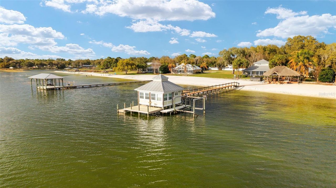 Positioned along the shoreline of Lake Weir, this exceptional lakefront residence located on 4.54 acres offers direct water access, private beach frontage, and a seamless blend of indoor and outdoor living. The open-concept main floor features pine wood flooring, crown molding, and a gas fireplace with a classic brick surround. Integrated audio flows throughout the main living areas, primary suite, and lanai, while panoramic eight-foot glass doors installed in 2025 provide stunning water views and effortless transition to the screened outdoor entertaining spaces. The oversized dining room is perfectly oriented towards the lake, providing direct access to the exterior living space for effortless hosting. Meticulously planned for efficiency and grand-scale entertaining, the chef-inspired kitchen features a Samsung Smart stainless-steel suite, including a double wall oven and a center island with an induction cooktop. Granite countertops and a generous breakfast bar accommodate seating for seven, while a walk-in pantry with custom shelving and a dedicated eight-foot custom coffee bar provide extensive storage and preparation space. For added convenience, the home features a custom-curated laundry suite equipped with double Samsung Smart Champagne Edition washers and dryers, complemented by custom cabinetry and a functional wet sink. The home continues to impress with a spiral staircase leading to a spacious game room and bunkhouse equipped with built-in sleeping for six and a billiards area. For movie enthusiasts, a first-floor dedicated home theater offers multi-level seating for six, in-wall surround sound, and a wet bar, with glass doors that overlook a second lanai and the lake. The primary suite serves as a private retreat featuring Kohler fixtures and an oversized, fully tiled shower, while a separate guest wing ensures privacy with three additional bedrooms and a full bath. Outside, the Florida lifestyle is fully realized with a screened lanai and a large Tiki hut with composite flooring set upon a private sugar sand beach. The property also includes a private dock and dock house equipped with two boat lifts, supporting a full range of boating and water sports on Lake Weir. Completing this estate is a detached guest house providing a full one-bedroom, one-bathroom layout with a sleeping loft and kitchen, all situated above a massive six-car garage. Additional infrastructure includes a 2.5-car main garage with covered access to the residence and an expansive concrete parking area featuring multiple recreational RV utility hookups, ensuring ample space for guests and hobbies alike.