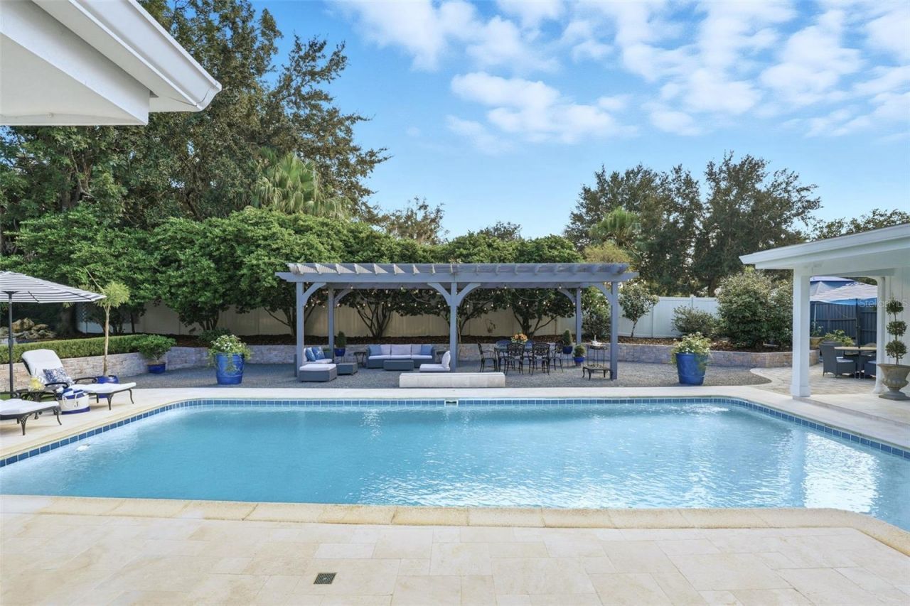 Totally traditional. This luxury single-story home is in the desirable Sevilla neighborhood in Winter Park. Sitting high and dry on approximately a half-acre, beautifully landscaped lot. Original home was mostly gutted down to the studs in 2011-2012 and completely re-done. Interior layout boasts formal living with bay window and tall ceilings, dining room with antiqued mirror set into extensive moldings and trim, plus a library/den with a tongue and groove wood vaulted ceiling and a wall of bookshelves and built-ins. The spacious family room with a white-washed brick, wood-burning fireplace wall and vaulted ceiling is all open to the breakfast area and kitchen. The gourmet kitchen features custom inset cabinet drawers and doors, white marble slab backsplashes, Kohler farmhouse sink and a large island with a deep prep sink. The kitchen is a chef's delight with a 48-inch Viking gas range, Viking warming drawer, Jenn-Air refrigerator, wine refrigerator and a Bosch dishwasher. The kitchen also has amazing storage and two large pantries. There are a total of four bedrooms (two are in the in-law suite suite) and three full baths. Throughout the home are beautiful real 3/4-inch-thick and 5-inch-wide plank walnut floors, beam and coffered ceilings, French doors, oversized picture windows and designer accents lighting. French doors off the family room open to seamlessly blend indoor and outdoor living, leading to a covered lanai with travertine stone tile overlooking a resort and entertaining backyard. Huge swimming pool and a 30-by-15-foot pergola with Bistro lighting, which is a wonderful spot to relax, dine and play, all on a tiny pebble surface, like an Italian driveway! French garden fountain, rose garden and synthetic turf for pets make the backyard a haven. The home's floor plan offers a desirable layout with huge primary bedroom with a generously sized en-suite bath with dual sink counters, amazing Roman walk-in shower, jetted tub with bubblers and two large walk-in closets. Guest wing features a spacious bedroom and bath and the West Wing is a full In-law apartment, including a bedroom, handicapped bath, full kitchen and its living room (which would be easy to be converted back into the 4th bedroom - plans available). Imagine having a wonderful space for in-laws or an adult family member that needs space of their own. Just a short drive or bike ride from Park Avenue, this open and inviting home has easy access to Park Avenue, AdventHealth, downtown Orlando and is zoned for A-rated schools. Surround sound through most of the house and CAT 6 wiring throughout. Recent additional remodeling and updating have taken place including all new paint inside and out, as well as a new roof and gutters in 2023. A detailed list of all renovations is available upon request.