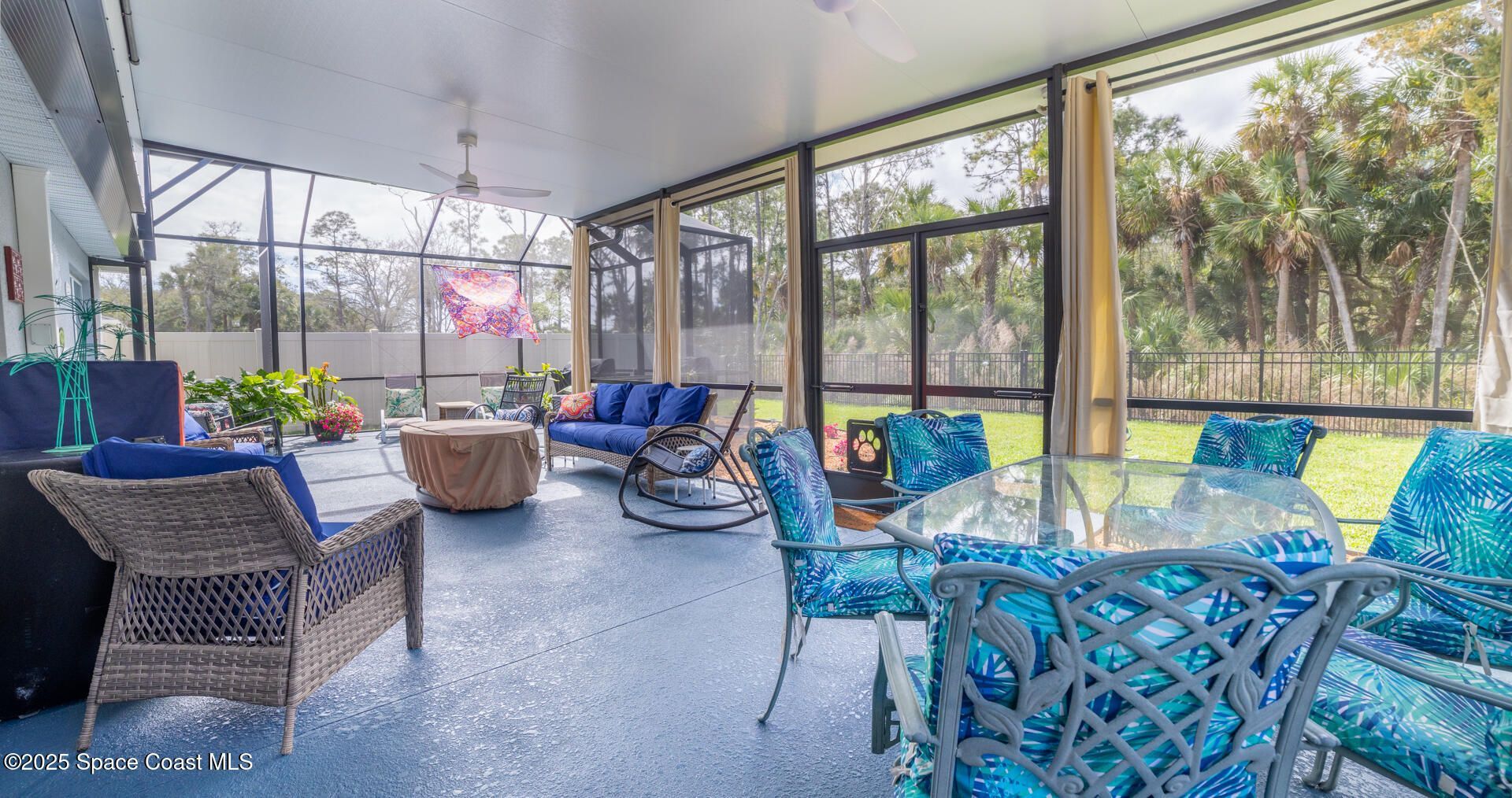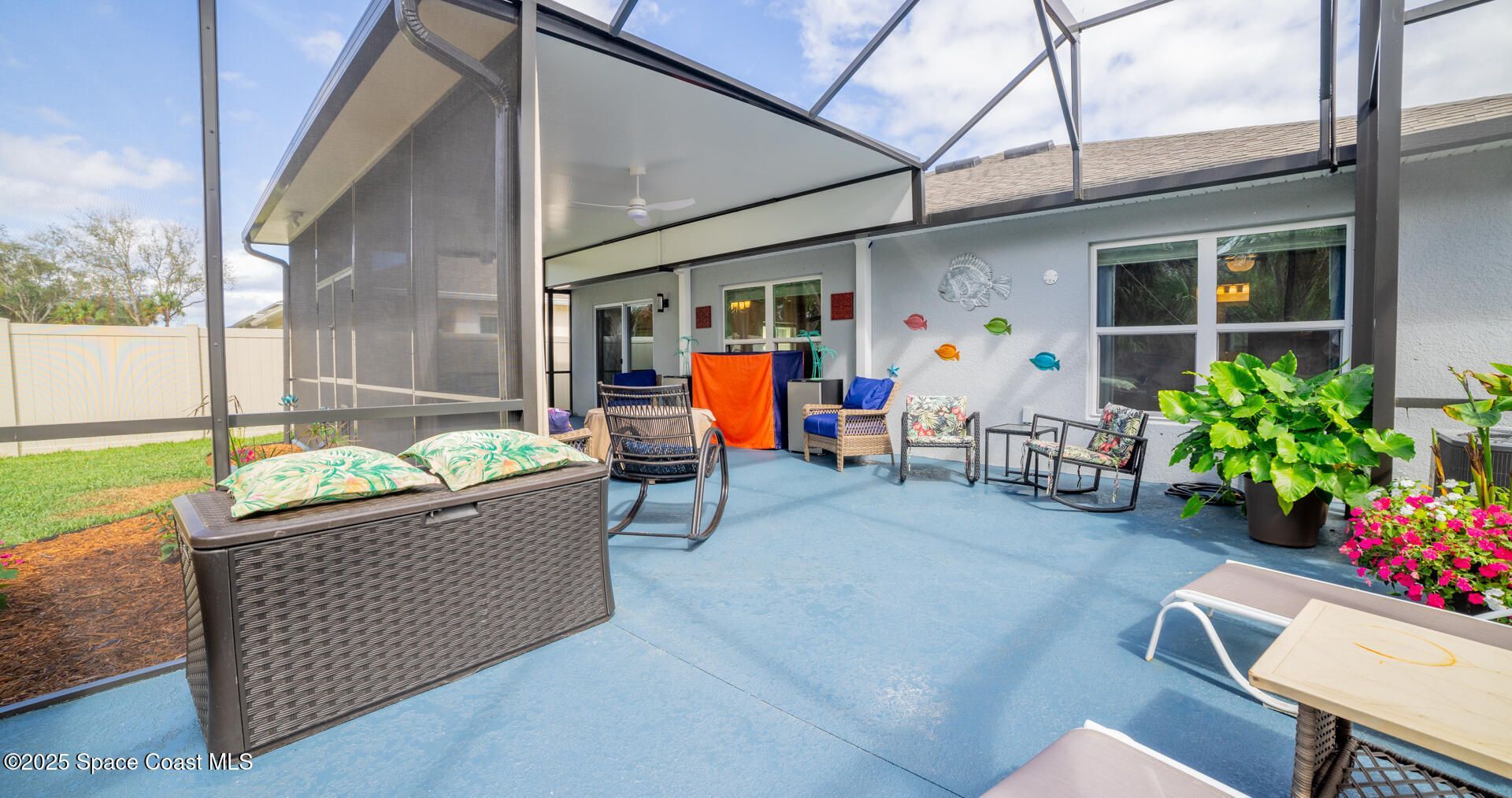 Experience elevated living in this better-than-new, impeccably upgraded home in exclusive Verona. Perfectly positioned w/ conservation views, this home showcases a seamless open-concept design: designer kitchen featuring granite countertops, and an expansive great room ideal for refined entertaining. A true standout, the 700 sq ft screened lanai spans the entire home and is prepped for a hot tub with reinforced support and electrical--creating a private outdoor retreat for year-round enjoyment. The fenced, professionally enhanced backyard has new irrigation and sod for added privacy and polish. Interior upgrades creating an energy efficient home include room-darkening shades in the primary suite, ceiling fans, blinds, added attic insulation, and programmable thermostat. Enjoy resort-style amenities: clubhouse, pool, splash pad, pickleball courts, playground. Watch rocket launches from your own front yard! Ideally located near I-95, beaches, Kennedy Space Center, SpaceX, & Blue Origin.