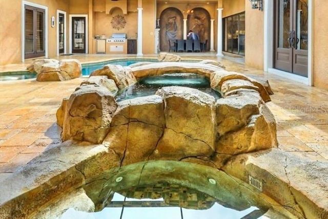 Along the serene waters of the Tomoka Preserve, stands a Mediterranean palazzo of rare distinction, created to be a piece of art in its own right. A scenic drive through the preserve, lined with majestic palms draped in Spanish moss, leads to this private waterfront estate offering a perfect balance of elegance and tranquility. Resting on 1.24acres of private lagoon front, this award-winning custom estate offers both prestige and seclusion. Blending elegance with nature, occasional deer may pause to watch you fish or canoe from the backyard. At the end of a quiet cul-de-sac, the home greets visitors with a regal canopy entrance, a sweeping-wide circular driveway, Venetian columns, Italian curved terracotta roof, paver-lined paths and tropical landscaping. A life-size 'Signora dell'Acqua fountain (lady of the water) and river rock gardens complete the essence of a Mediterranean retreat. Past the main gate, one will find a 2,294-sq.ft screened courtyard, complete w/ Venetian-style stone bridge across the travertine pool complex, featuring a waterfall, dipping pool, heated hot tub and a main saltwater heated pool with a swim-up bar, water curtain and controllable LED lighting. Outdoor dining is enhanced with hand-painted frescoed walls, a roofed kitchen & grill, an oversized fireplace anchors the lanai. Multiple covered seating areas, from coffee retreat by the spa to a central dining pavilion. Inside, soaring ceilings, some rising up to 16ft, hand-plastered walls, Italian-style frescos, and grand crystal chandeliers set the tone. The Grand Room offers panoramic views of the river and courtyard; The chamber of custom display cabinetry is complemented by wine and coffee bar, complete with cast-iron French doors and frescos of the Italian countryside. Pocketing glass doors dissolve boundaries between indoors & out, inviting breezes from the lagoon. The kitchen combines elegance with function: Monogram appliances, a 6-burner stove w/ griddle, double ovens, dual Fisher & Paykel dishwashers, floor-to-ceiling custom cabinetry, a granite island, a spacious walk-in pantry, serving stations, and abundant storage. The master suite is a private sanctuary with oversized windows and direct access to the outdoor spa. Hand-painted frescoed hallway leads to dual vanities & expansive stone double shower. Two oversized walk-in closets offer crystal chandeliers and solid wood shelving. Additional bedrooms include a in-law suite w/ a private courtyard entry, a junior suite with French doors and a flexible media lounge/ bedroom w/ veranda access. Beyond the bedrooms, the estate surprises at every turn. A walnut-clad office conceals a secret 'Hide-Away Room, while the Relaxation Room features a fireplace & river views. Card Room opens to the dining space. Even the foyer impresses with a cast-iron French glass door and chandelier. While steeped in romance, the home is built for peace of mind. Some of the recent updates include a 6-zone irrigation system with new well, pump, Wi-Fi controls, termite protection, upgraded pool/ spa mechanics & heaters. The new water filtration system provides exceptional water quality. This estate also offers a whole-house vacuum system, 32-camera monitoring, invisible dog fence, hurricane shutters, a hidden safety room, a climate-controlled garage & a whole-house generator. Truly a rare offering: being one of two estates with direct lagoon access to the Halifax River. This Venetian Palazzo is more than a home- it's a statement.