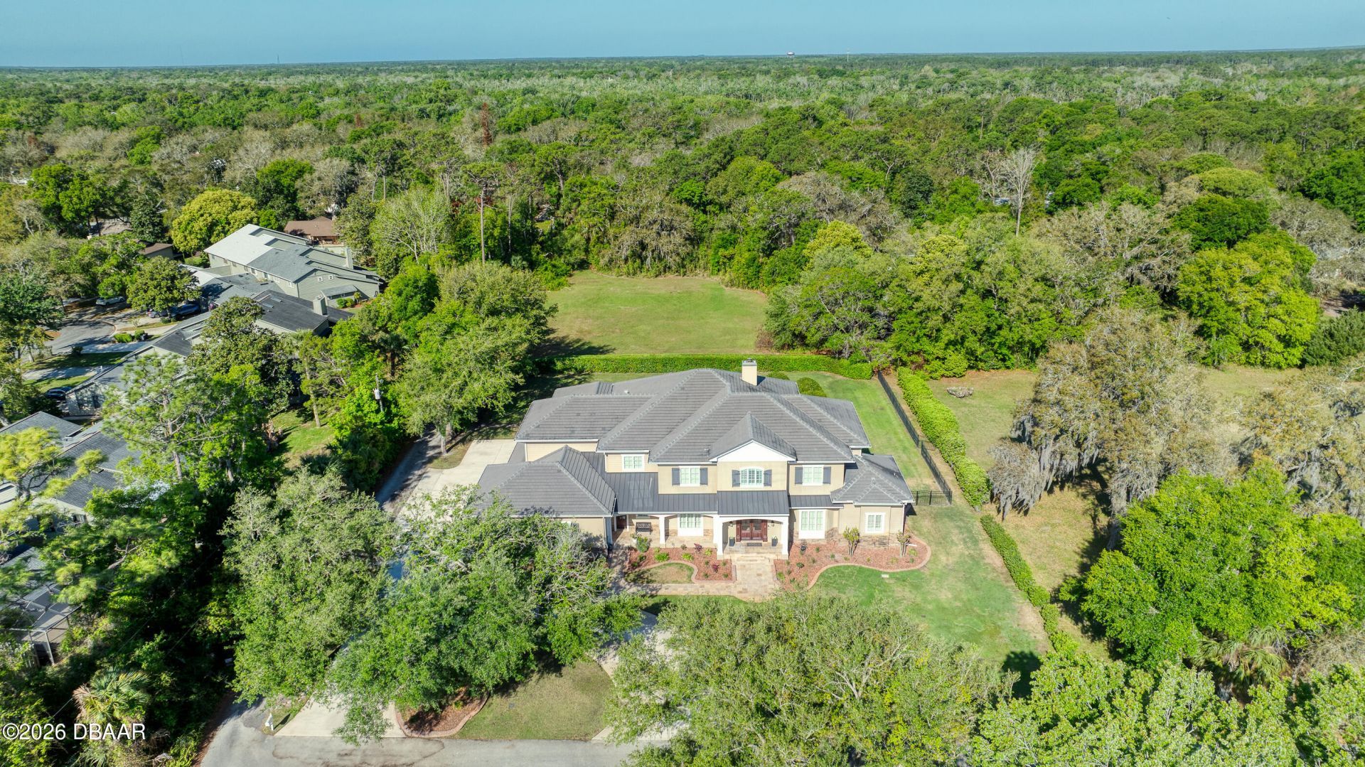 Timeless elegance discreetly nestled in the heart of Ormond Beach! This exceptional five-bedroom, six-bathroom estate, complete with a four-plus-car garage and private saltwater pool and spa, offers both convenience and seclusion. Situated in a tucked-away community of one-acre parcels just minutes from shopping, dining, cultural venues and the beach, this home comes with the option to purchase an additional adjacent acre to further enhance privacy. Constructed in 2009 with uncompromising attention to quality, no expense was spared in creating this enduring and sophisticated family estate. Encompassing just under 10,500 square feet of combined indoor and outdoor living space, the residence is ideally suited to accommodate a growing family or multi-generational household.The oversized four-plus-car garage is located on the south side of the home and features two double-width doors, one of increased height to accommodate a recreational vehicle or boat with trailer.The moment the residence comes into view, its circular driveway, majestic oak trees, stone-lined raised landscape beds, and stone-tiled front porch with stacked-stone apron set a tone of grandeur. Additional architectural details including the metal and tile roof, framed windows, shiplap siding, decorative millwork, and stately double wood and glass entry doors further underscore the home's refined character.Upon entry, a formal foyer welcomes guests, with the main staircase to the right and the formal dining room to the left. Rich Brazilian walnut hardwood flooring extends throughout the main living areas. Ahead, the impressive great room featuring soaring 23-foot ceilings and a gas-burning fireplace serves as the heart of the home. Double French doors flanking the fireplace open to a covered rear lanai overlooking the private 18' x 27' saltwater pool and eight-person waterfall spa.The generously proportioned chef's kitchen is appointed with bull-nose granite countertops, high-end Monogram appliances including a four-burner gas range with center grill and convection oven, two dishwashers, and an expansive 9' x 6' walk-in pantry. The large center island incorporates a prep sink, warming drawer, one of the dishwashers, and bar seating for four. Two chefs? Not a problem as the outdoor summer kitchen provides a second cooking arena.Adjacent to the eat-in kitchen is a formal game room featuring a fully equipped bar with beverage cooler, ice maker, and dual taps. The space is designed for entertaining with a full-sized pool table, tabletop shuffleboard, game table, and large flat-screen television. Built-in cabinetry houses the home's comprehensive security and audio systems.The main level also includes the primary suite with its own set of French doors leading to the outdoor living space. The luxurious en-suite bathroom features a glass-enclosed walk-in shower, separate soaking tub, dual vanities, and spacious his-and-hers walk-in closets with custom organizers. Additional main-floor amenities include a private office with built-in cabinetry, multiple storage closets, a full laundry room with its own service entrance, and two half baths.The upper level offers four additional bedrooms, each with an en-suite bathroom and custom cabinetry, a second full laundry room, an art room/library, and an secondary great room/game room with two walk-in closets potentially suitable as an additional primary suite. This level is also home to an expansive covered balcony with sweeping views of the private backyard and the adjacent undeveloped acre l