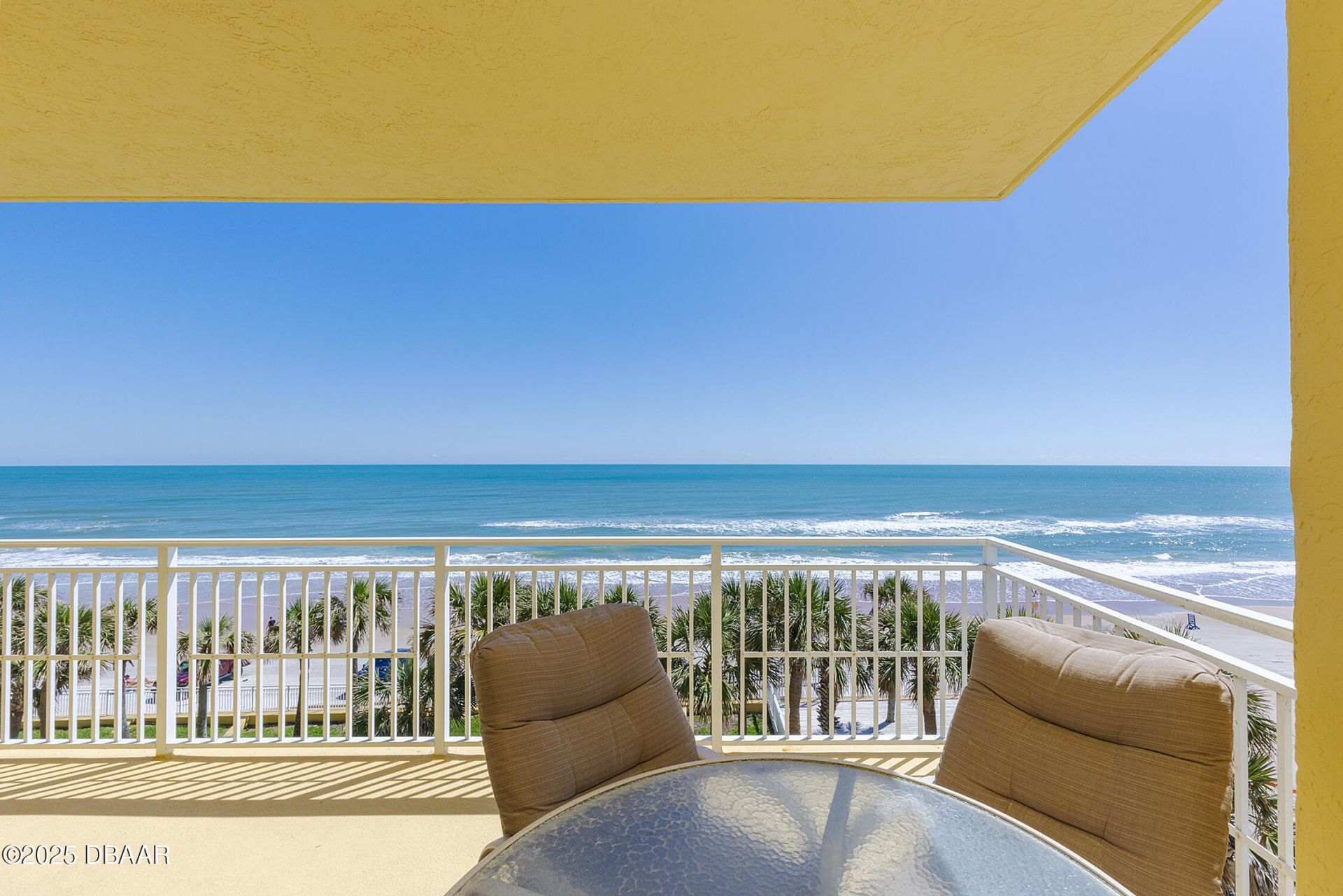 Serene, southeast-corner oceanfront living can be yours from this luxurious turn-key condo at the Mediterranean in Daytona Beach. Breathtaking beach views are afforded by an array of perfectly-placed windows and the sprawling oceanfront balcony. As you enter through a formal foyer, behold large living areas, appointed with wood flooring and crown molding, that overlook the brilliant blue Atlantic coastline. The open kitchen is perfect for meal prep, providing ample cabinetry, gorgeous granite counters, and stainless steel appliances. Entertain friends and family in the large gathering room, enjoy beachfront dining, and retreat for breezy evenings on the balcony - what could be better! The primary suite boasts direct balcony access and a primary bathroom which features a dual vanity, walk-in shower, and a relaxing jetted tub. Also take note that while this condo is on the second residential floor, because of the garage and common area levels