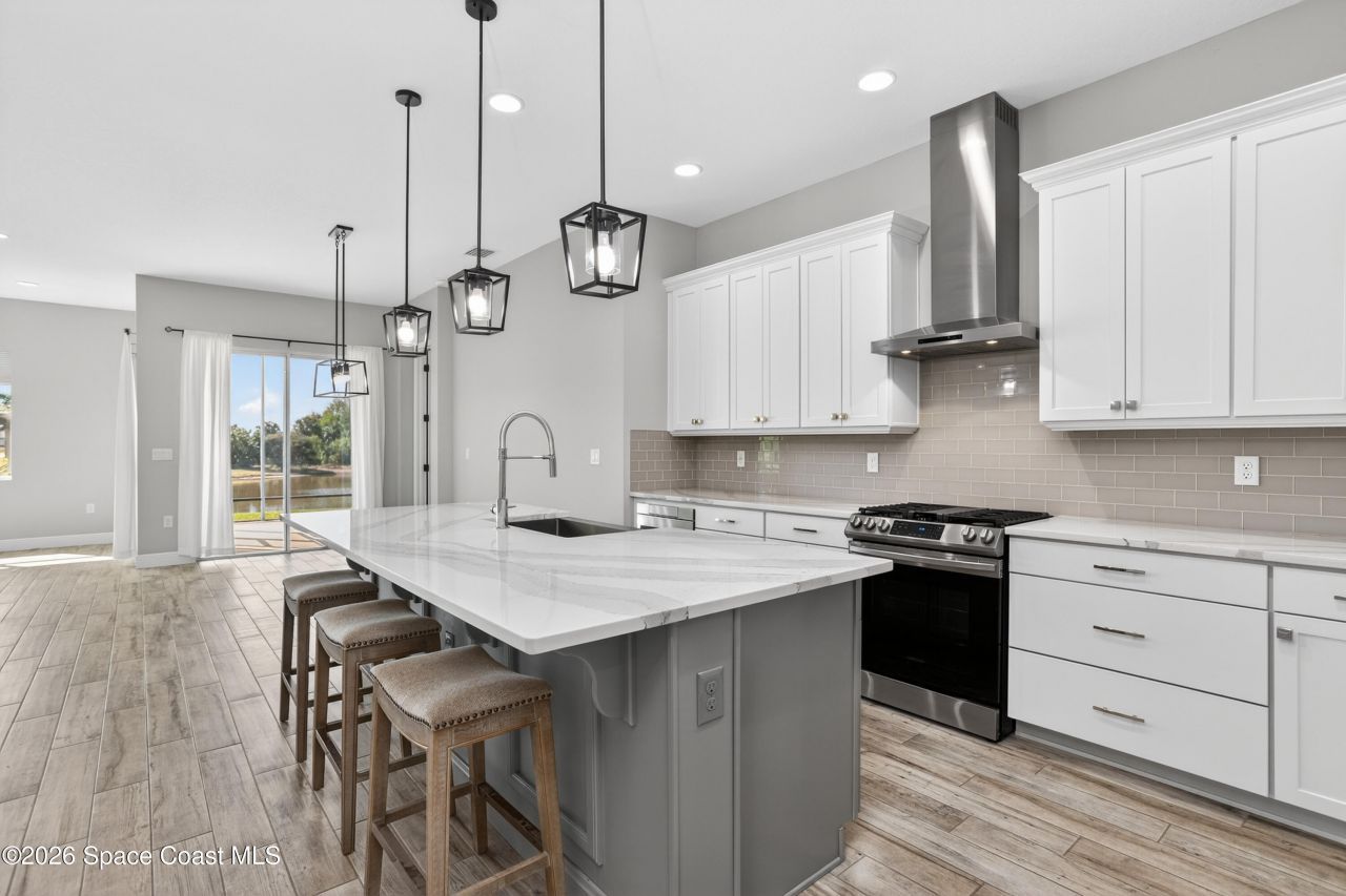 Beautiful lake views in the heart of Viera! Built in 2022, this desirable Saratoga II model in the Avalonia Carefree Living community offers stylish, low-maintenance living. This 3 bed, 2 bath paired villa features an open floor plan with 10-ft ceilings, 8-ft doors, and wood-look tile throughout the main living areas. The kitchen showcases custom white soft-close cabinetry, quartz countertops, oversized island, stainless appliances, gas range with hood, and subway tile backsplash. The primary suite includes tray ceilings, walk-in closet, and glass shower with rainfall head. Enjoy peaceful water views from the extended screened lanai with vaulted enclosure. Additional features include tankless gas water heater, Storm Shutters, concrete block construction, and in-wall pest defense. HOA includes landscaping, irrigation, exterior maintenance, roof system, termite protection, cable and internet. Conveniently located near Addison Village Club, top schools, shopping, dining, and I95