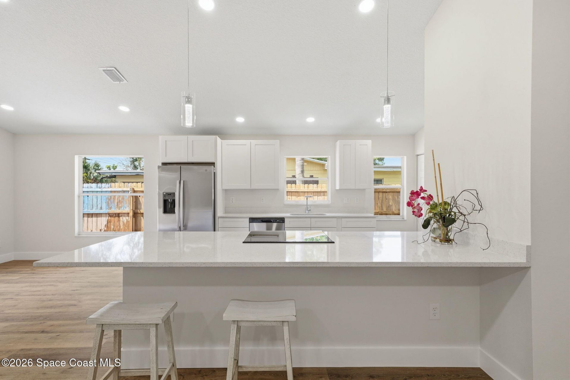 Welcome to West Melbourne with NO HOA. Recently renovated, a shortened list of some major enhancements include: new roof, water heater, a/c, flooring, modern cabinets, popcorn ceilings GONE, etc...We cant wait to show off what weve been up to inside! With almost 1900 total square feet in this home, the cathedral ceilings adding to the great room, creating an open, beautiful living space. This property will be fully fenced and features a 2 car garage with a spacious driveway accommodating up to four additional vehicles. Survey done, saving buyers that money. Nicely rated school systems in this area. Minutes from shopping, dining, and entertainment, approximately a 10 minute drive to the beach. A few more details in the works, but ready to be seen.