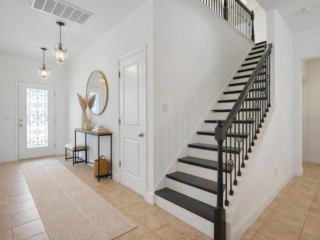 Located in the sought-after Lake Preserve community of Orlando, this move-in ready Astoria Plan C by Meritage Homes offers the benefit of an established floor plan without the wait of new construction. Positioned just minutes from Lake Nona, St. Cloud, Kissimmee, Medical City, and SR 417, the home is also zoned for A-rated Luminary Middle School. Residents enjoy a Mediterranean-style clubhouse, playground, pool, dock, splash pad, and cabanas that create an elevated, private, island-inspired setting within a pet-friendly, bike-friendly neighborhood. The home features a brick driveway, stone exterior, and tile roof for standout curb appeal. This split two-story floor plan includes a guest bedroom and full bath on the main level, with three additional bedrooms upstairs. The kitchen features a gas cooktop and flows seamlessly into the living room, creating an inviting layout for everyday living and entertaining. Sliding glass doors open to a fully screened, paved lanai, ideal for relaxing in the sun or gathering around a fire pit. For added peace of mind, the property is equipped with a Generac 22kW Guardian generator with a transfer switch to help keep you prepared during hurricane season.
