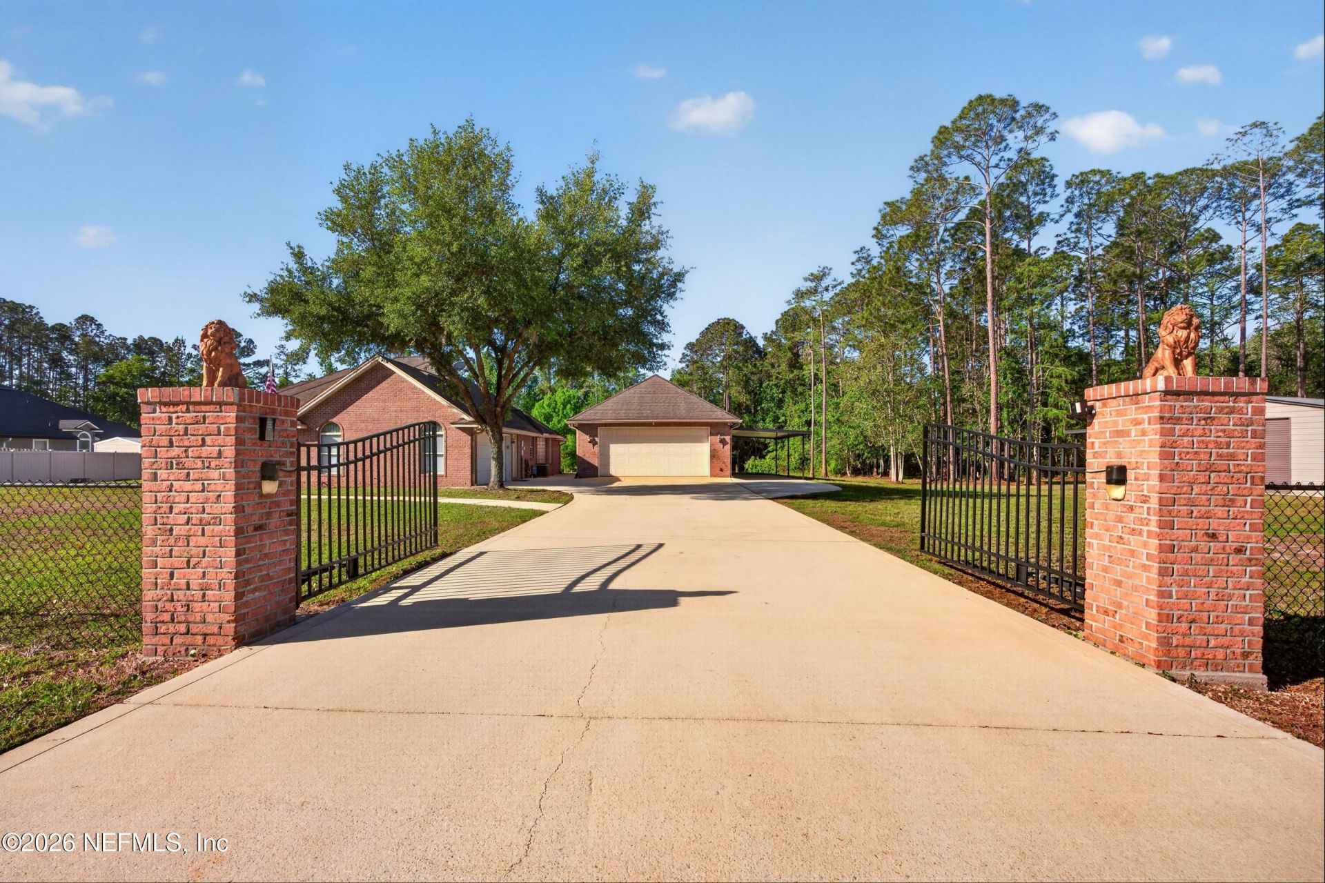 Charming all-brick home in the desirable Lake Asbury area, perfectly situated on 2.42 acres of land. This spacious residence features 3 bedrooms and 2 bathrooms, in a split bedroom arrangement, open floor plan and kitchen overlooking back yard. Enjoy the convenience of an attached garage along with a detached garage for extra vehicle or storage space, with half bath in garage/workshop.Surround sound in Dining and LRA separate brick storeroom and a well-equipped workroom with two 800-gallon compressors connected to the workshop provide ample space for projects and storage. The workshop has it's own 200-amp electrical box and water, as do the other two buildings. The property is partially fenced with a gated entry, ensuring privacy and security. Also, has a cover for a boat storage, etc.Relax or entertain in the back glass-enclosed patio, a perfect spot to enjoy the outdoors year-round. This unique property combines versatility and comfort in a peaceful, picturesque setting.