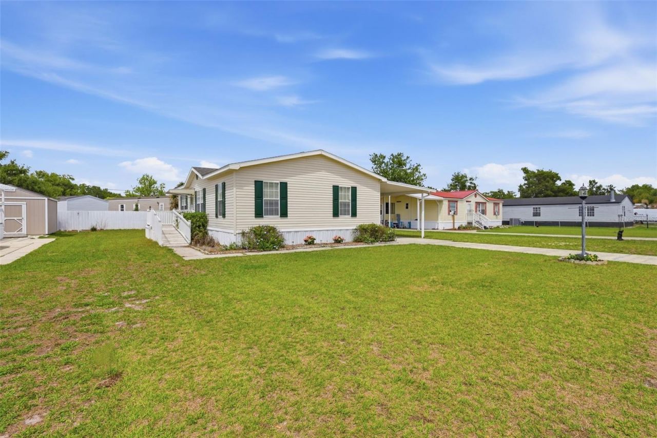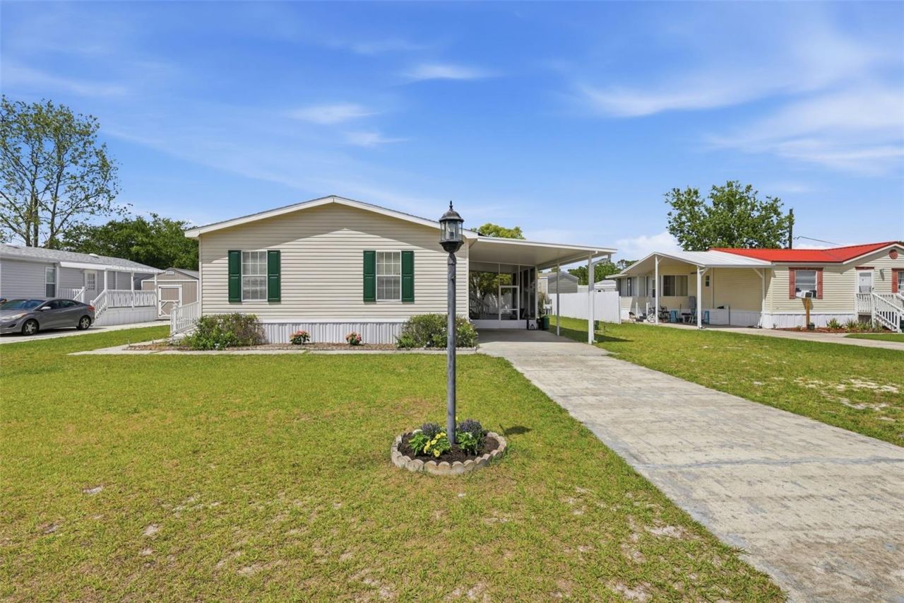 Amazing Snowbird Retreat! Pride of ownership shines in this well-maintained, like-new manufactured home-gently lived in only six months out of the year. Major update includes a roof replaced in 11/2019.Step inside to a light and bright interior featuring upgraded luxury vinyl plank flooring in the main living areas and primary bedroom. All rooms are equipped with ceiling fans and upgraded blinds for added comfort and style.The spacious primary suite offers a walk-in closet and a large ensuite bathroom complete with double sinks, a stand-up shower, featuring an upgraded commode, and an oversized linen closet with ample storage. The desirable split floor plan provides privacy, with the secondary bedrooms and guest bath located on the opposite side of the home.The open-concept kitchen overlooks the dining and living areas and includes white cabinetry with crown molding, a breakfast bar, and an upgraded Bosch dishwasher. All appliances convey, including the washer and dryer.Exterior features include a front ramp for easy accessibility, a covered carport, and a large screened porch-perfect for relaxing. The backyard offers additional space to enjoy, complete with a large shed and partial fencing.Bonus: This home can be sold fully furnished-just bring your clothes and start enjoying your Florida retreat right away!Energy Efficiency: Home is equipped with leased solar panels, helping to offset utility costs. Buyer to assume lease (details available).Move-in ready and ideal for seasonal or year-round living!