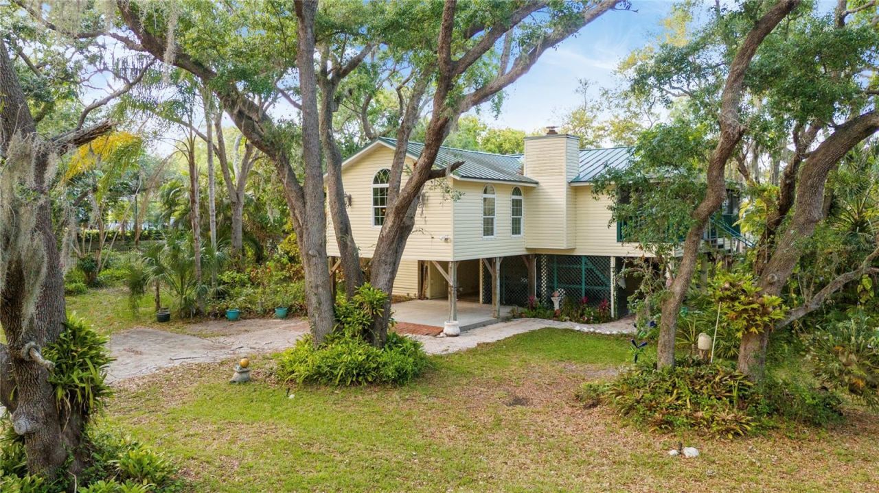 Experience this enchanting coastal retreat in the highly sought-after Crystal Beach / Palm Harbor golf cart community, set on a secluded and expansive 0.57-acre lot in Crystal Beach, with no HOA or deed restrictions-an increasingly rare find. Tucked away down a private road and surrounded by majestic century-old oak trees, staghorn ferns, and lush tropical landscaping, this unique Old Florida-style elevated home offers over 25,000 square feet of combined indoor and outdoor living space, including wrap-around screened decking, high ceilings, and seamless indoor-outdoor flow. Inside, the open-concept layout features bamboo flooring, a gas-burning fireplace, a galley-style kitchen with breakfast bar, and a light-filled sunroom with vaulted ceilings and chandelier that can easily serve as a third bedroom. The spacious primary suite includes a walk-in closet, French doors, and a spa-like bath with slipper tub and walk-in shower overlooking tranquil garden views. Meticulously maintained, the home also includes a durable metal roof, a recent 4-point inspection, and three covered carport spaces with room for boats, RVs, and golf carts. A private rear gate provides direct access to the Pinellas Trail, with walking distance to Live Oak Park, Gulf Shore Park, and Crystal Beach Pier, plus an easy bike ride to Honeymoon Island State Park. Located in a top-rated school zone including Ozona Elementary and Palm Harbor University High School, and just 30 minutes to Tampa International Airport with easy access to St. Petersburg, Tarpon Springs, Ozona, Clearwater, and Gulf beaches, this one-of-a-kind property offers a compelling blend of privacy, land value, and coastal lifestyle, ideal as a primary residence, second home, or unique investment opportunity in one of Florida's most charming historic waterfront communities.