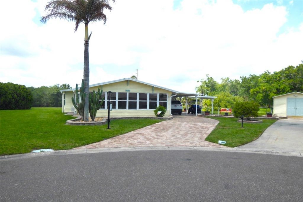 Welcome home to your peaceful slice of Florida living! This inviting 2004 single family home sits on three combined lots in Palm Village Ranch and offers that laid-back, worry-free lifestyle. Built with solid poured concrete walls and ceilings, it features a durable metal roof, 2016 HVAC, Corian countertops, and a 2024 water conditioning system! Plank luxury flooring throughout, impact windows and Bahama storm shutters and a Generac Generator for peace of mind in unpredictable times. Pavers line the driveway, walkways, and surround the home and a large shed.