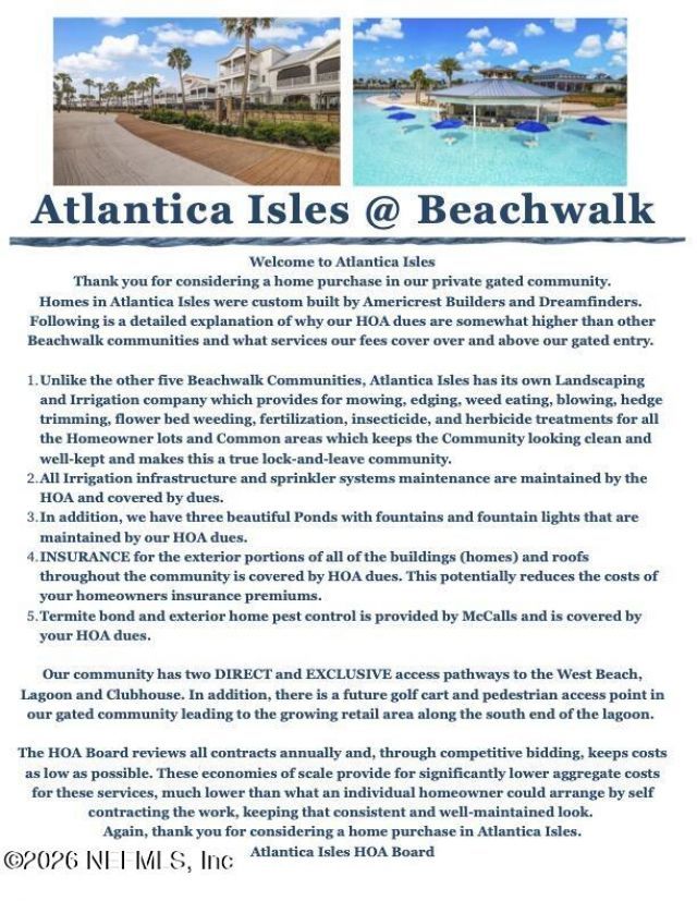 Welcome to Atlantica Isles! This wonderful two story 3 bedroom 2 and 1/2 bathroom townhome is in the heart of the Beachwalk Community in St. Johns County. As you step into the home the open floor plan creates a seamless living and dining experience. The Fully Equipped Kitchen comes with all newer appliances. The large island and gas range is perfect for those that love to cook and entertain guests. All 3 Bedrooms are upstairs with a jack & jill bathroom connecting the two guest bedrooms. The primary bedroom is equipped with a double vanity and spacious walk in closet. Just a brief walk to the clubhouse and amenities this home offers both lifestyle and comfort. Don't miss out on your opportunity to call Beachwalk your home!
