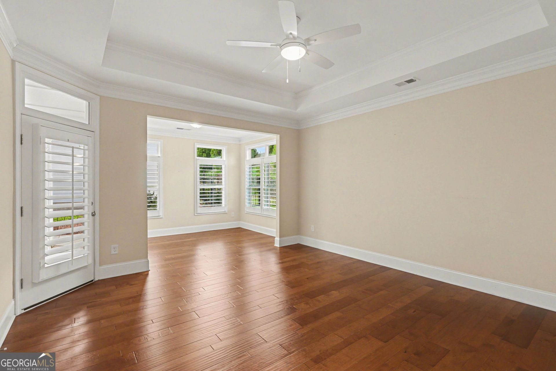 Rare one-story retreat in the heart of The Courtyards at Camden. From the moment you step inside, the warmth of hardwood floors, custom plantation shutters, and a cozy gas fireplace set the tone for easy, elegant living. The open-concept layout flows effortlessly into a chef's kitchen with white cabinetry, granite countertops, and stainless steel appliances, including a refrigerator, making entertaining feel effortless. The oversized owner's suite is a true sanctuary, featuring a private sitting area, direct patio access, a luxurious step-in shower, a double vanity, and crown molding throughout. Three bedrooms, two full baths, and thoughtful finishes at every turn. Step outside and you'll find even more to love, a sweeping covered front porch, a screened-in side patio perfect for morning coffee or evening cocktails, complete with fans for airflow, and a fully fenced backyard. The temperature-controlled garage adds incredible flexibility, whether you need a home gym, craft room, or workshop. All of this within a vibrant 55+ community offering a pool, poolside fire pit, clubhouse, fitness center, covered outdoor gathering area, and dog park. HOA covers lawn maintenance, termite bond, and trash, so you can simply enjoy the lifestyle. Major interstates, shopping, and dining are all just minutes away. Homes like this don't last. Schedule your private tour today.