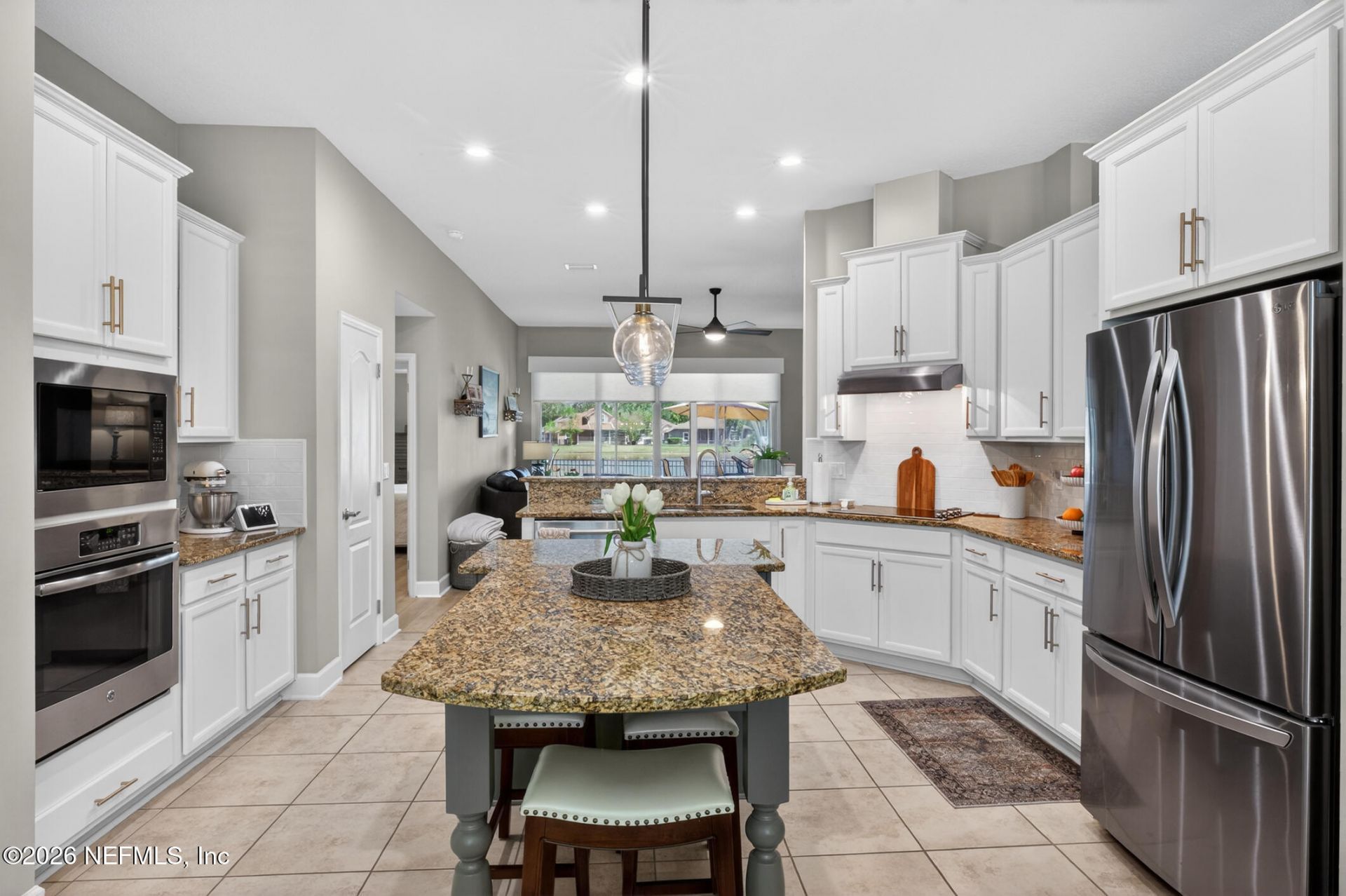 Exceptionally well-maintained single-story home offering 3 bedrooms plus an office. The split floor plan includes defined living & dining areas for a functional flow. The spacious gourmet kitchen is equipped with a microwave and oven tower, cooktop, hood vent, and a prep island with ample additional storage. French doors leading to the primary bedroom & a double tray ceiling add architectural interest. The backyard overlooks the widest part of the pond with a fountain view. Outdoor space includes a screened lanai, extended patio, firepit, fully fenced yard. The garage includes built-in storage and an epoxy floor. Updates include: LVP flooring, new carpet in bedrooms, updated dishwasher & fridge, new lighting & landscaping, added cabinets in laundry room. Located in St. Johns County with highly rated schools, close to shopping, dining, Costco, and Durbin Park, with beach access within 30 minutes.