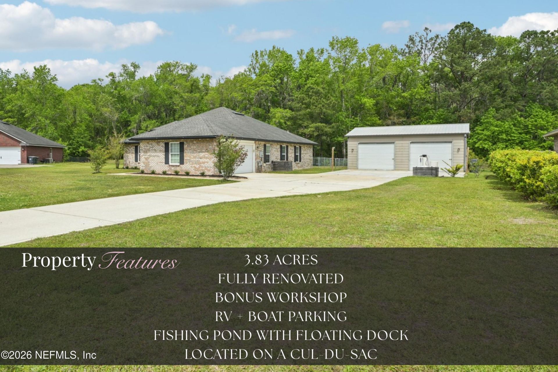Set on a sprawling 3.83-acre lot, this beautifully renovated 4-bedroom, 2-bath home offers the perfect blend of modern upgrades + peaceful country living. Inside, you'll find brand new LVP flooring throughout, fresh interior paint, all new door hardware, new stylish light fixtures inside + out, creating a clean, modern, move-in-ready feel. The updated kitchen features brand new LG appliances, providing both quality +efficiency for everyday living. Step outside to enjoy the property's standout features, including a 720 sqft workshop with brand new electrical wiring, ideal for hobbies, storage, or business use. The oversized driveway offers plenty of space for a camper, RV, boat, or multiple vehicles. Just steps into the backyard, relax by your fishing pond complete with a custom floating dock, perfect for quiet mornings or evening sunsets. With space, upgrades + unique outdoor amenities, this property delivers the rare opportunity to enjoy comfort, and privacy all in one place!