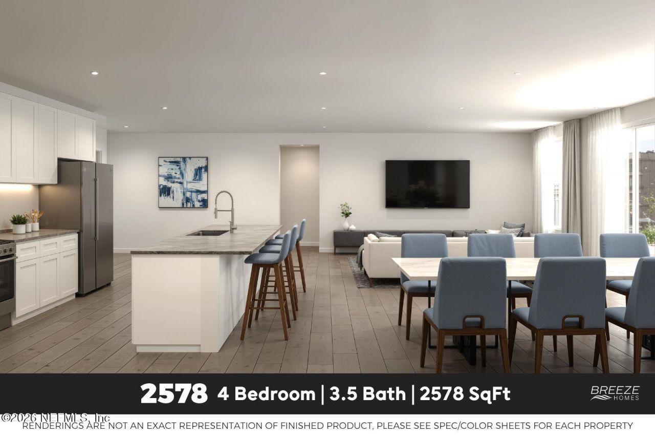 ASK ABOUT MAX INCENTIVES: 5 PERCENT TOWARDS CLOSING COSTS AND 4.99 PERCENT FIXED RATE!Discover your dream home on one of the biggest lots in Kings Preserve! This thoughtfully designed floorplan by Breeze Homes offers 2,578 sq. ft. of living space featuring 4 bedrooms and 3.5 beautifully designed baths. This home stands out with a rare 3-car garage and a massive rear porch perfect for outdoor living.Inside you will find wood-look tile flooring throughout the main areas for elegance and durability, with cozy carpeted bedrooms for a warm retreat. The kitchen is a chef's dream with granite countertops, a full suite of appliances, and counter seating for easy entertaining. Enjoy peace of mind with a builder warranty and take advantage of massive closing cost assistance. Don't miss the opportunity to own this exceptional home on a premium oversized lot - schedule your tour today!
