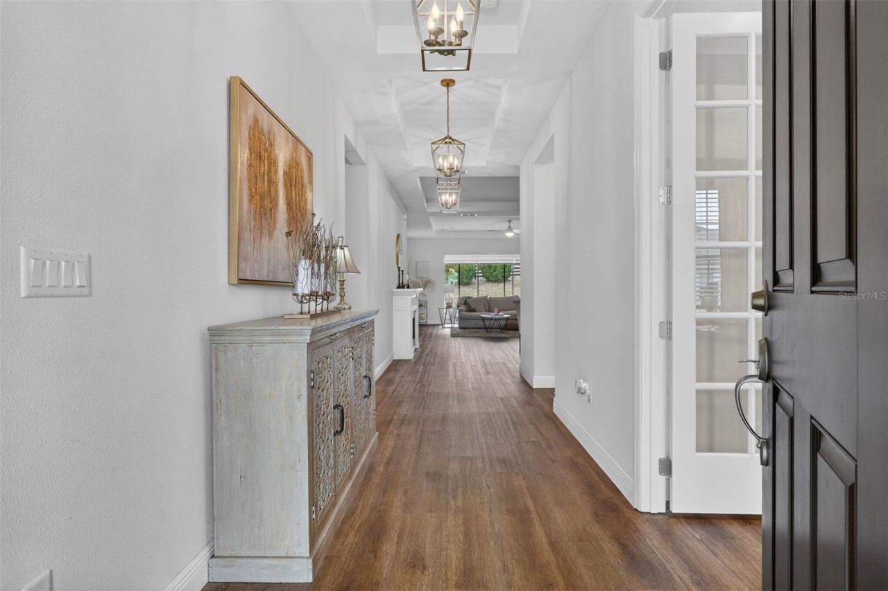 Experience elevated Florida living in this impeccably maintained, Taylor Morrison-built home located in the highly sought-after Canyons at Highland Ranch! Offering 4 bedrooms, 3.5 baths, 2,713 square feet of thoughtfully designed living space, and a rare 3-car tandem garage, this home perfectly blends style, function, and comfort. From the moment you step inside, you'll notice the seamless flow of the open-concept layout, enhanced by luxury vinyl flooring throughout the main living areas and bedrooms. The spacious living room is a true showpiece, featuring a tray ceiling, cozy electric fireplace, and built-in surround sound-creating the perfect atmosphere for both relaxing nights in and entertaining guests. The gourmet kitchen is designed to impress, boasting stainless steel appliances including a cooktop and built-in wall oven, sleek quartz countertops, a farmhouse sink, oversized island, and designer pendant lighting. Whether hosting gatherings or enjoying everyday meals, this space delivers both beauty and functionality. The private primary suite offers a serene retreat with its elegant tray ceiling and spa-inspired en suite bath, complete with a walkthrough shower, soaking tub, double vanity, water closet, and a generous walk-in closet. Thoughtful design continues with flexible and private secondary spaces. One bedroom with French doors is ideal as a home office, den, or flex space, while the additional bedrooms each feature their own en suite baths-perfect for guests or multi-generational living. Step outside to the screened lanai and unwind while taking in peaceful conservation views with no rear neighbors-offering both privacy and a true connection to nature. As a resident of Highland Ranch, you'll enjoy resort-style amenities including a community pool, splash pad, cabana, and basketball and volleyball courts. Conveniently located near the South Lake Trail, Turnpike, top-rated schools, shopping, and dining, this home delivers both lifestyle and location. This is a rare opportunity to own a home that truly checks every box-schedule your private showing today and be sure to explore the immersive 3D virtual tour to fully experience all it has to offer.